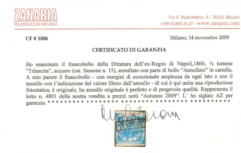 garanzia" della Zanaria Filatelici (datato 12 luglio 2012, quando presumibilmente il pezzo fu venduto la prima volta, dopo la sua